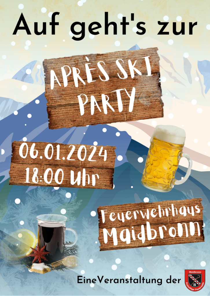 Im kommenden Jahr lädt die Freiwillige Feuerwehr Maidbronn wieder zu ihrer alljährlichen Après-Ski-Party ein. Mit Glühwein, DJ und Bar wird nochmal gefeiert, bevor der Fasching losgeht. Auf geht ́s … am 14.01.2023 ab 18:00 Uhr am Feuerwehrgerätehaus in Maidbronn